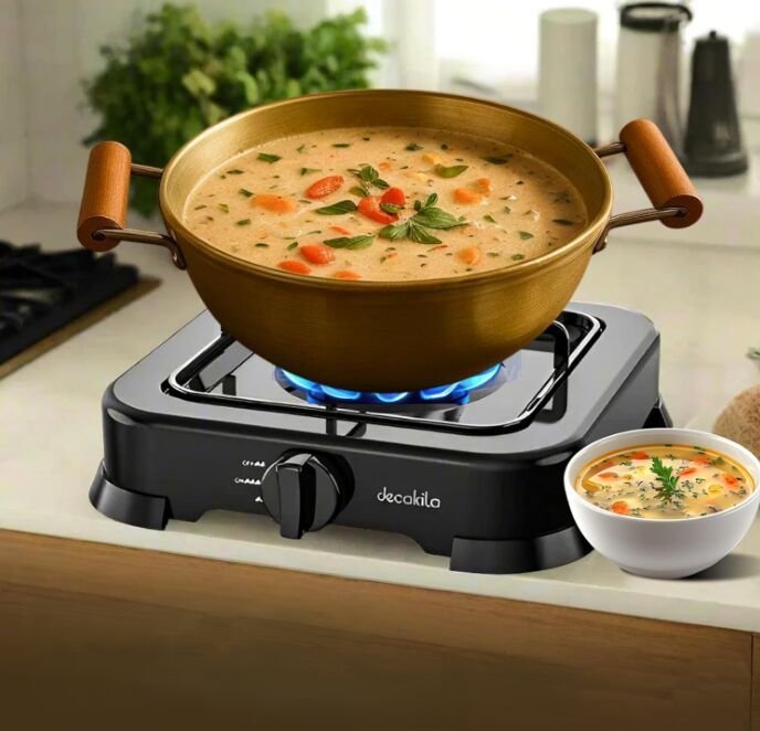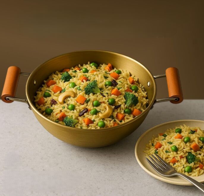 "A traditional brass kadhai, renowned for its excellent heat conductivity and even heat distribution. Ideal for deep-frying, sautéing, simmering curries, and preparing a wide range of Indian and international dishes."