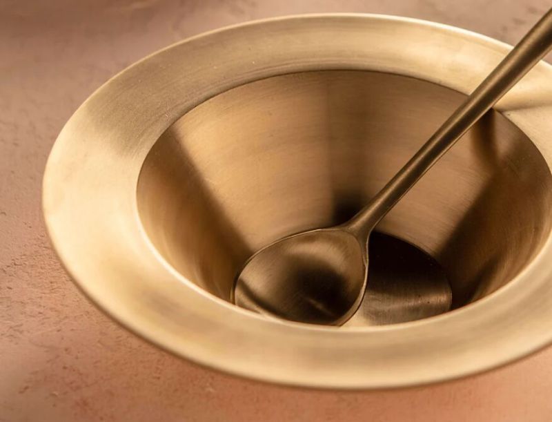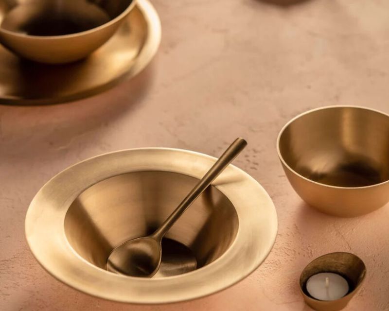 A Kansa serving dish is a handcrafted piece of art, showcasing the rich heritage of Indian metalware. Its warm, golden-bronze hue and subtle sheen give it a rustic yet elegant appearance. The dish often features a shallow, bowl-like shape with a smooth, polished interior and a slightly textured exterior. The rim may be simple and rounded or adorned with delicate, hand-beaten patterns.
