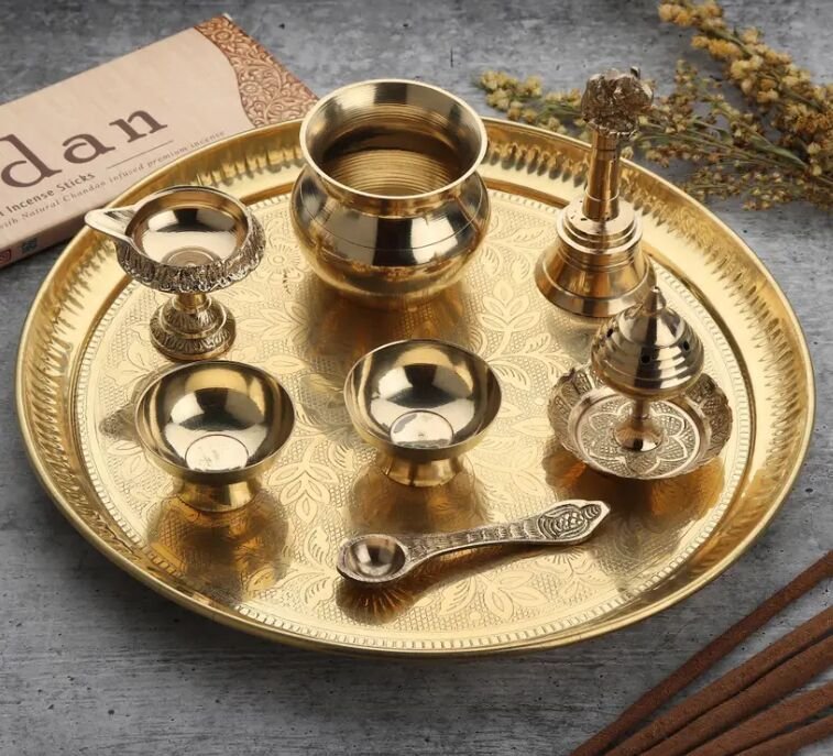 "A beautifully arranged pooja thali, ready for your spiritual offerings."